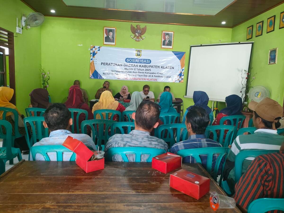 Perda nomor 8 tahun 2025 merupakan perubahan Perda Kabupaten Klaten Nomor 15 Tahun 2023 mengenai Pajak Daerah dan Retribusi Daerah. Sosialisasi Perda tersebut diikuti 50-an undangan, yang terdiri dari Ketua Rt dan RW, Badan Permusyawaratan Desa (BPD), perangkat desa, dan undangan lainnya.