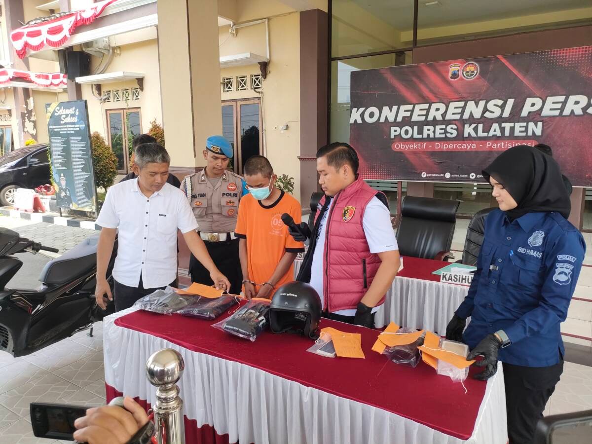 Pengungkapan kasus perampasan alat komunikasi elektronik berupa HP milik DI disampaikan oleh Kasat Reskrim Polres Klaten AKP Taufik dalam konferensi pers di Polres Klaten, Selasa (5/8/2025). Dalam konferensi pers Taufik menjelaskan awalnya DI sudah kenalan lewat chattingan dengan akun yang mengaku bernama Iqbal. Chattingan antara DI dengan Iqbal lewat Medsos aplikasi telegram. Percakapan mereka lewat chattingan cukup inten. Kemudian mulai ada janji untuk bertemu. Janjian pertemuan yang baru kali pertama pada Sabtu (26/7/2025) sore bulan lalu. Kemudian Iqbal menjemput DI di pinggiran jalan dekat rumah DI.